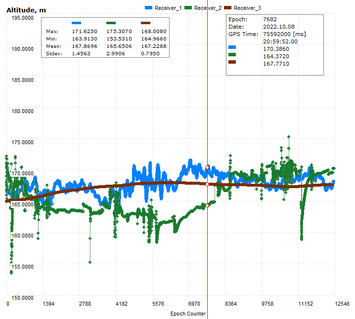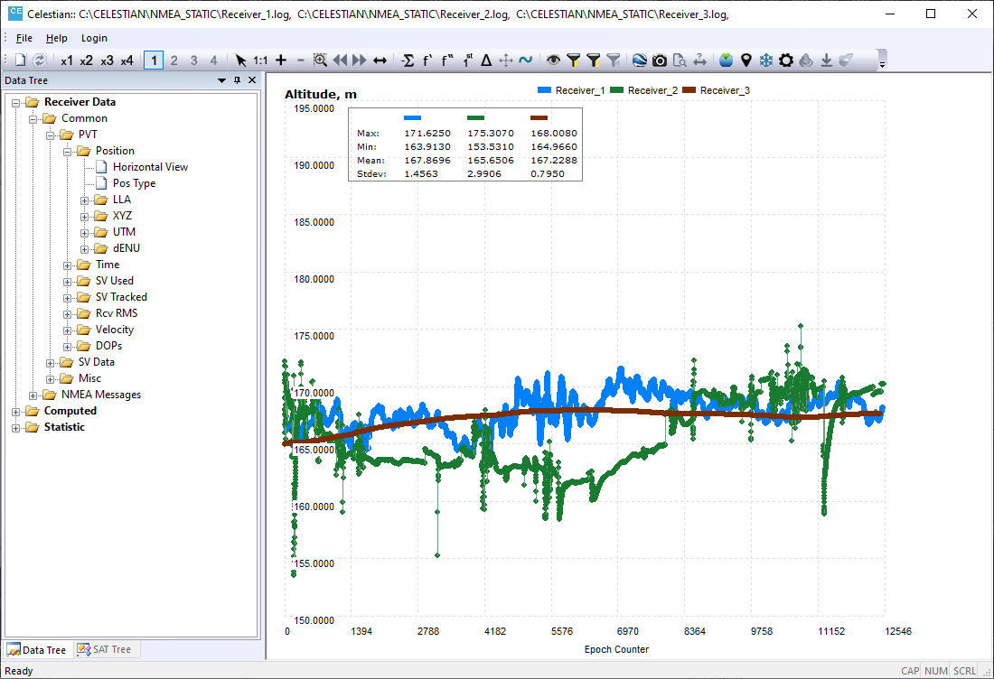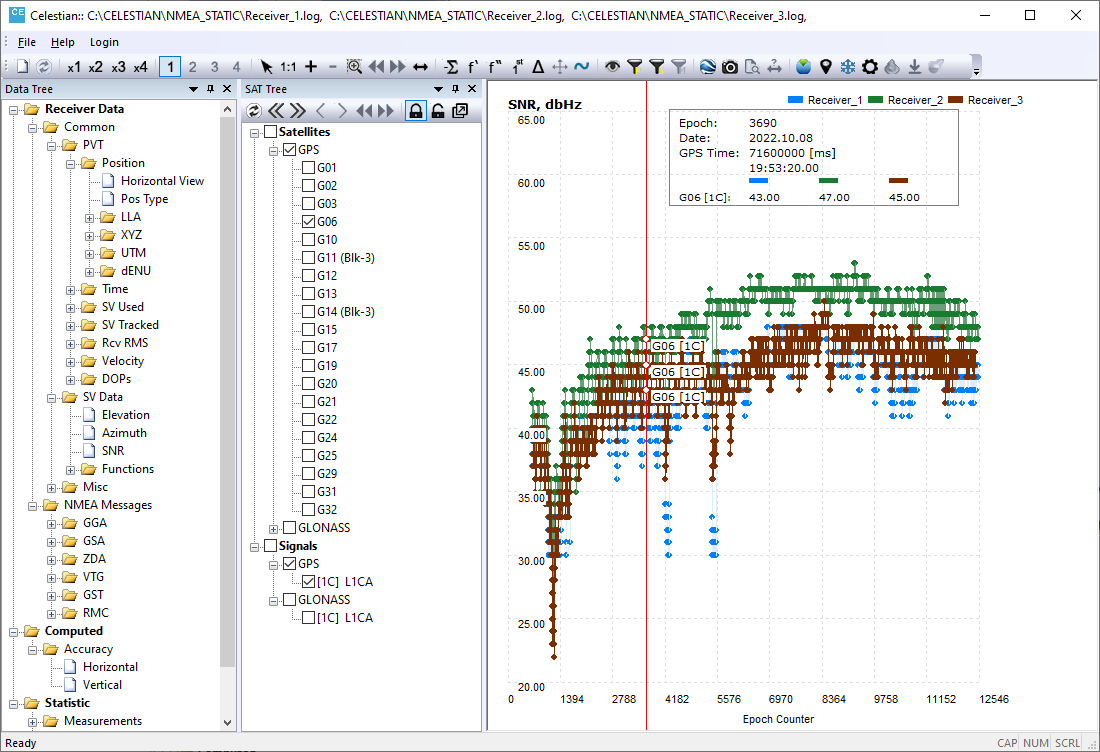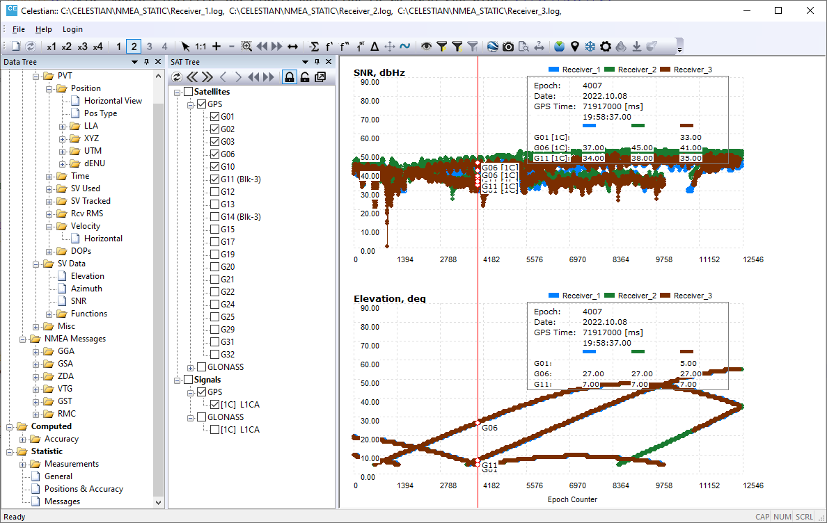 Multiplot feature allows to analyze several data types simultaneously, say Number of Tracked SVs, their Elevations, Position etc.